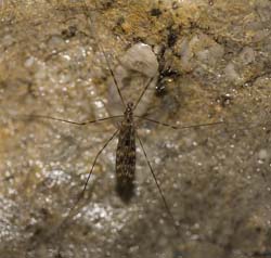 Family TRICHOCERIDAE Crane Flies. The Winter gnat or crane fly Trichocera maculipennis (8mm) can be found quite deep underground in large cave systems and has been recorded from Dow cave, Mongo Gill and Pikedaw Calamine Caverns. The adult is widely distributed but rarely seen, the larvae are attracted to baits such as rotting meat. It looks like a very small, delicate crane fly.